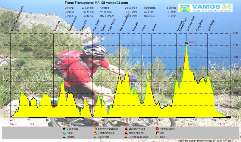 Die Trans Tramuntana ist aufgrund Ihrer 6 verschiedenen Übernachtungen für nur jeweils eine Nacht sehr aufwendig in der Planung und auch nicht zu jeder Zeit durchführbar, da Mallorcas Hoteliers eine Übernachtung nicht zu jeder Saisonzeit akzeptieren. Deshalb benötigen wir immer ein bisschen Vorlaufzeit für die Planung. Bei Interesse an dieser Tour bitten wir Euch um rechtzeitige Kontaktaufnahme mit Angabe Eures Wunschdatums, Telefonnummer und der Anzahl der Personen.